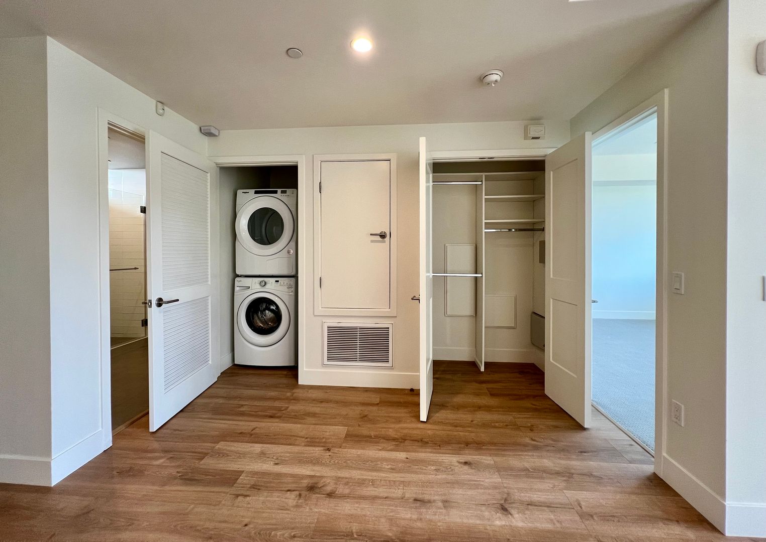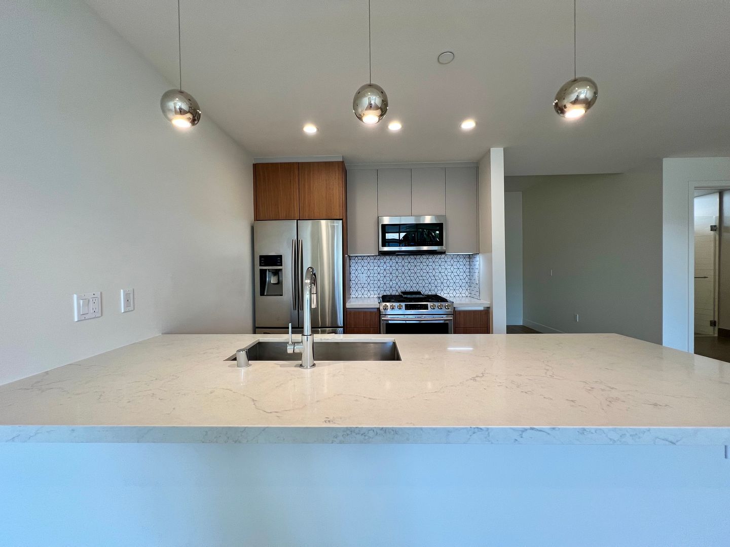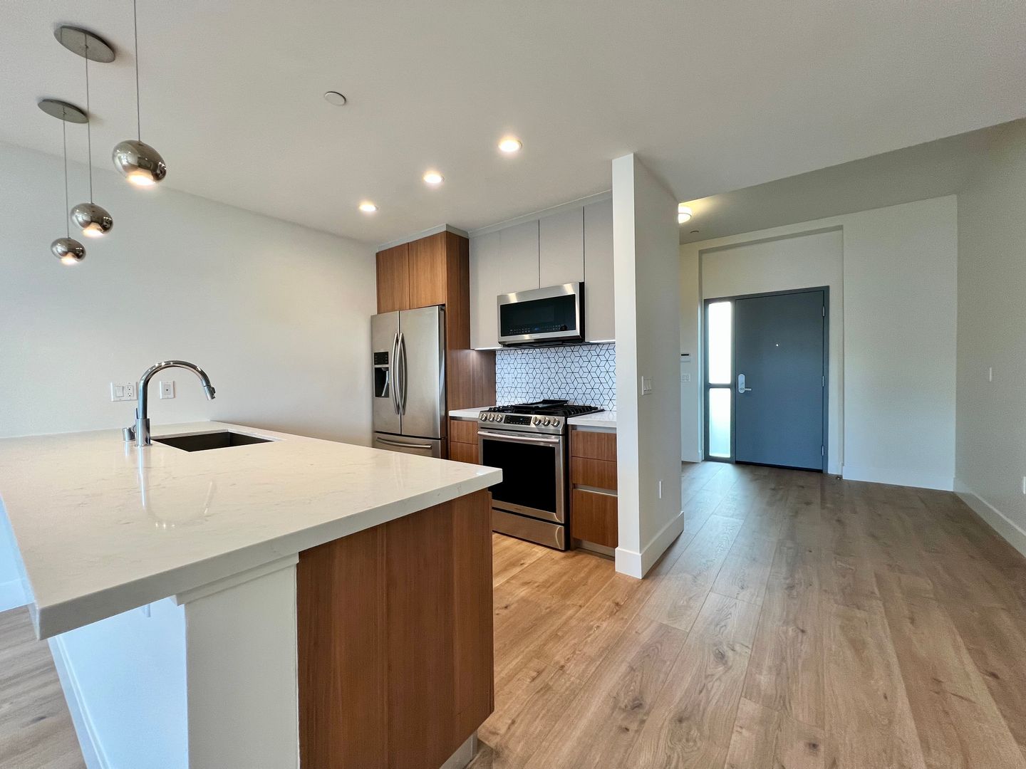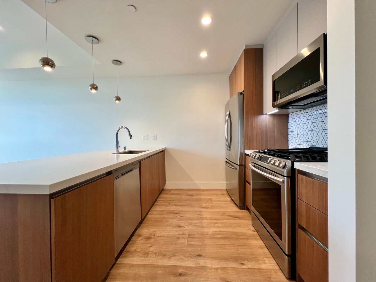 The thoughtfully designed interior includes 9-foot ceilings, floor-to-ceiling windows, and western exposure that brings in warm afternoon light. The kitchen features Italian-designed cabinetry, marbled quartz countertops, and Samsung stainless steel appliances. Additional highlights include in-unit washer and dryer, generous storage throughout, and a flexible den/office space ideal for working from home or accommodating guests.