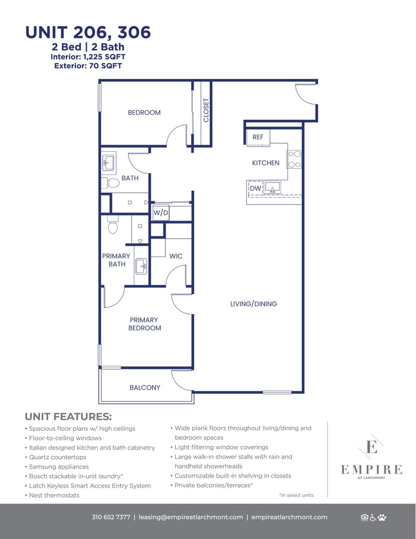 Upgrade your lifestyle in this luxurious and spacious 1225F SF 2-bedroom 2-bathroom apartment residence featuring southern and western exposures, a private balcony and plentiful storage in-unit. This modern residence boasts top-of-the-line amenities such as stainless-steel Samsung appliances, Latch access system, central AC/heat with Nest thermostat, high ceilings with LED lighting, wide plank wood flooring, and oversized walk-in closets with customizable closet systems. Spa like bathrooms with custom tilework, and Bosch laundry appliances all add to the luxury and convenience.